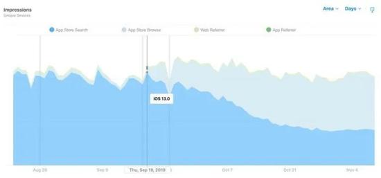 一款产品发布的更新越多,它就会越经常地出现在应用商店的更新推荐中,其潜在用户其中找到并进行下载。因此,要获得更多自然量下载,那么在iOS或安卓系统发布新版本时,我们也需要同步发布适配版本的更新。下图是iOS 13发布后对展示量的影响示意图: